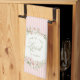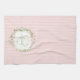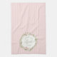 This kitchen towel has a wreath of pink flowers in a wreath with a pink striped background with text that says "Christ the Lord is Risen."