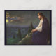 beautiful vintage painting of christ sitting on a mountain looking at a city at the bottom of the mountain. catholic image of jesus contemplating as he views a city in the evening. vintage art in grey, turquoise, and violet.