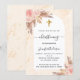 An arch frame and rose gold marble print as background. Decorated with rose gold and pink florals, roses and pampas grass. Personalise and add a name and details.