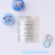 A modern, elegant baptism, celebrating two babies, a girl and a boy. Faux silver metallic looking background decorated with blue and pink faux glitter sparkles and a golden cross. Personalise and add names and ceremony details. Black coloured letters.