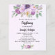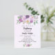 A violet, lavender watercolored background. Decorated with violet and purple watercolored flowers and greenery and a golden cross. Personalise and add a name and reception details.