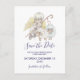 A christian themed save the date postcard. Designed with a serene angel with yellow wings holding a shepherds crook. Sitting beside 2 white fluffy lambs. Eggshell white background.