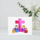 Cute illustration of a Christian family standing together next to a giant cross symbol. They all have happy smiling faces. The background area of this image is completely transparent so that you can easily customise and choose your own background colour. Image available on various gifts and products.