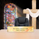 A heavenly scenic depiction for Your Church Fellowship Name desk plate for Pastor, Priest, Deacon, and other Clergy. It is designed with a beautiful pastel orange sky, fluffy clouds, and sunlight beams. #Christian #Catholic