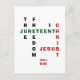 Christian JUNETEENTH Crossword Postcard, showing the inspirational quote TRUE FREEDOM IN CHRIST JESUS in a crossword format including JUNETEENTH, and is set against a plain white background. The main text is based on the Scripture reference from John 8:36 - HE WHO THE SON (JESUS) SETS FREE IS FREE INDEED. The Bible reference JOHN 8:36 is customisable, so you can replace the text with your MONOGRAM or NAME. This Juneteenth postcard would make an ideal greeting card for Juneteenth. Be prepared to share your faith, as this would also make a great conversation starter. Choose from a wide selection of Black History Month and Juneteenth designs on cards, invitations, clothing, home decor and gifts, designed by Berean Designs.