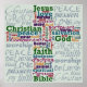 This religious word art / subway art design features words associated with Christianity arranged into the shape of a cross. Words include: God, Jesus, Christian, Bible, faith, love, peace, kindness, salvation, spiritual, Commandments, righteous, compassion, scripture, disciples, Christ, lamb, good, hope, truth, pray, Heaven, saviour, worship, passion, gospel, charity, pure, holy, joy, Lord, verse, church, miracle, belief, bless, grace, glory, will, spirit, angels, trinity, and cross.