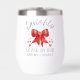 Stylish Christian Valentine LAVISHLY LOVED Coquette Bow Wine Tumbler for wives with CUSTOMIZABLE TEXT, designed to celebrate God's love during Valentine's Day season. Text reads LAVISHLY LOVED BY GOD AND MY HUSBAND with red hearts and a bow in the popular coquette aesthetic. The bottom line is CUSTOMIZABLE so you can PERSONALIZE by adding your name or replacing with '1 John 3:1', or other text. The verse reads: 'See what great love the Father has lavished on us, that we should be called children of God! And that is what we are!' You can also PERSONALIZE YOUR MESSAGE at the back. The text currently reads MY AWESOME GOD BLESSED ME WITH AN AWESOME HUSBAND. Ideal Christian Happy Valentine's Day matching couple's Wine Tumbler gift for your wife. Matching gifts available.