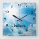 Christian theme wall decor clocks designed with a beautiful scenic sky with sun beams and Christian cross in the background and modern clock face numbers along with the words I Believe. Designed for a Church, home decor, or inspirational design.