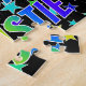 This fun, vibrant, birthday-themed jigsaw puzzle design features the message "HAPPY BIRTHDAY, CHRISTIE" with the characters having a colourful rainbow spectrum inspired gradient pattern, in addition to a lively star field background pattern. An exciting puzzle like this might be used to send birthday greetings to somebody named Christie. [~Z0000468]