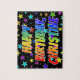 This lively and exciting birthday-themed jigsaw puzzle design has the message "HAPPY BIRTHDAY, CHRISTINE" with the characters having a colourful rainbow spectrum inspired gradient pattern, along with a vibrant star shapes background pattern. A vibrant puzzle like this might be used to send a birthday greeting message to somebody named Christine. [~Z0000468]