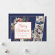 Merry Christmas three photo holiday card features a beautiful watercolor winter foliage illustration on a dark blue background with script and serif fonts. This minimal, simple and elegant design is ready for you to customise with your own family photos and message. Change the text or background colour or keep as shown here. Please browse the Merry Christmas Family Photo Card Collection for more designs.