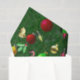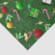 collection of random multicolored Christmas themed items and images set on a background of evergreen needles includes bulbs, wrapped gifts, candy canes, gingerbread man, lights and ornaments