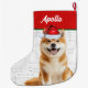 So sweet, this two-sided Christmas stocking has a watercolor illustration of a holiday dressed Akita dog and your pup's name on both sides with a woof word art background.