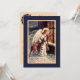 This vintage Christmas invitation shows an angel from heaven with a little deer bearing Christmas gifts looking in the window on Christmas Eve to bring peace and goodwill.