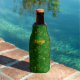 This bottle cooler has a Christmas design of angels and stars scattered about the design on a green background.