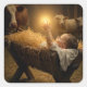 Baby boy in a manger, reaching out to a radiant golden light, while cows stand nearby, creating a serene and sacred scene.