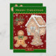 Christmas Cooking / Baking Card featuring vintage gingerbread man together with house and Christmas tree made from gingerbread and snowflakes falling around. Easily change new year and holiday message to you personalised family card.