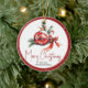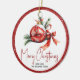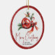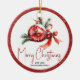 Christmas ball ornament with red bow and fir branches holiday Ceramic Ornament. It features a red Christmas ornament with a red bow and branches of fir. Around it there is a red border with white snowflakes. The back includes a cute family photo with the same border.
