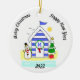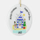 Beach Hut Christmas Tree decoration featuring a customisable blue and white beach hut standing on the sand topped with snow with a snowman and christmas tree either side, whilst the waves or the sea lap the seashore.