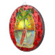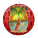 Happy Holidays from the warm sandy beaches of your favourite tropical island beach. Palm tree decorated with Christmas ornaments and lights, with a retro surfboard leaning against the Christmas tree in front a sunset over the ocean. Red holiday colour background of Hawaiian Honu sea turtles and Tiki Masks