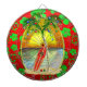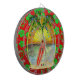 Happy Holidays from the warm sandy beaches of your favourite tropical island beach. Palm tree decorated with Christmas ornaments and lights, with a retro surfboard leaning against the Christmas tree in front a sunset over the ocean. Red and green holiday colour background of Hawaiian Honu sea turtles and hibiscus flowers.