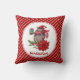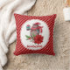 Cute Christmas bear with a scarf, Christmas present, and poinsettia. The background is red with white diagonal stripes. Custom your name
