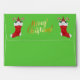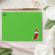 This envelope is green with a gnome with a white beard in the top of a red and white stocking with candy canes and clusters of holly leaves. The text Merry Christmas is in gold on the back flap. The inside is green with lighter green swirls.