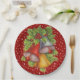 Christmas paper plates with large, bright Christmas bells in red, blue, and gold on holly and berries on a background of red with white snowflakes.