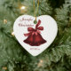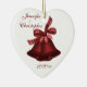 A plaid ribbon of rich burgundy/cranberry colour match a set of Christmas bells in the same rich colour. This heart contains the names of the bride and groom, and the wedding date on the front, and the back has the couple's last name. Great for the couple's first Christmas, and makes a nice souvenir for the family and wedding party.