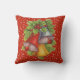 Christmas pillow with large, bright Christmas bells in red, blue, and gold on holly and berries.