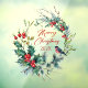 Christmas holly and red berries wreath accented by bullfinch. Merry Christmas script typography and customisable year text.