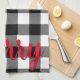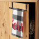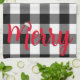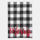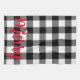 Red "merry" text in a calligraphy font style with Santa Claus hat on black and white buffalo plaid.