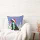 Festive Christmas Black Lab Holiday Dog dressed in santa hat and green and white scarf holding red polka dot christmas ornament in its mouth. Snowy winter background. Cute christmas pillow for lab lovers! © EMR Designs.