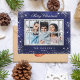 A deep blue background decorated with faux silver glitter, sparkling stars. The blue colour is uneven. Personalise and add your own photo, name and a year. With the text: Merry Christmas. A window overlay over your photo.