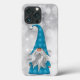 Sweet Christmas gnome in a blue suit on a silver sparkling background