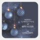 Beautiful blue Christmas tree and ornaments square stickers feature your name and Merry Christmas and Happy New Year in chic lettering. MATCHING items in our collection.