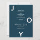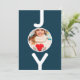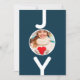 A simple modern minimalist Christmas card in blue and white. On the front: A classic blue background, with the word JOY written with white bold letters. The letter O is used as a photo frame. Personalise and add your own family photo. Back: Blue background and white text. Add your own holiday greetings and family name(s). The letters in the word JOY as decoration.