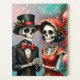 Christmas Bone Romance, A festive skeleton couple. This charming skeleton couple celebrates the festive spirit of Christmas. He wears an elegant black top hat decorated with holly sprigs and framed by a red ribbon. His black suit looks stylish and timeless, complemented by a bright red bow tie that adds a festive touch. She wears an elegant red bonnet with lace trim, also decorated with holly sprigs. In the background, lush Christmas tree branches decorated with red ornaments can be seen.