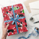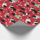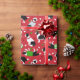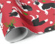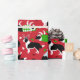Cute Border Collie dogs in festive holiday outfits wearing Santa hats, antlers, strings of lights and polka dot and argyle sweaters on a red background with scattered ornaments.