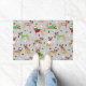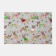 Cute Christmas dogs in festive holiday outfits. Border Terriers wearing Santa hats, antlers and argyle sweaters on a grey background with scattered ornaments.