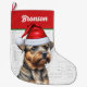 So sweet, this two-sided Christmas stocking has a watercolor illustration of a holiday dressed Border Terrier and your pup's name on both sides with a woof word art background.