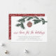 Invite friends to celebrate at your new home with our festive and modern holiday housewarming party invitations. Design features a hunter green pine bough adorned with a red and green ball ornament, and "new home for the holidays" in red calligraphy script lettering. Add your housewarming party details in hunter green lettering.