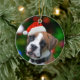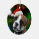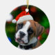 Fawn and white boxer dog wears a too small Santa hat and looks cute with bright Christmas lights in the background dog lovers Christmas holiday ceramic ornament