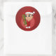 Design with an illustration of a cute smiling happy toddler boy, he is wearing red and white Santa Claus costume and holding a present ; Christmas holidays design with a red background