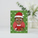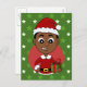 Design with illustration of a cute smiling happy African American boy with black hair, the boy is wearing a Santa Clause costume with red hat and holding a present; in red circle on green background with seamless pattern with green and white stars, To see more of my cartoon characters, please visit my store