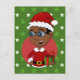 Design with illustration of a cute smiling happy African American boy with black hair, the boy is wearing a Santa Clause costume with red hat and holding a present; in red circle on green background with seamless pattern with green and white stars,