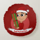 Round pillow with an illustration of a cute smiling happy toddler boy, he is wearing red and white Santa Claus costume and holding a present; with editable text template for your name or message, Christmas holidays design with a red background