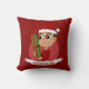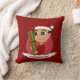 Throw pillow with an illustration of a cute smiling happy toddler boy, he is wearing red and white Santa Claus costume and holding a present; with editable text template for your name or message, Christmas holidays design with a red background