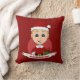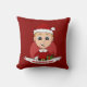 Throw pillow with an illustration of a cute smiling happy blonde-haired boy, he is wearing red and white Santa Claus costume and holding a present; with editable text template for your name or message, Christmas holidays design with a red background
