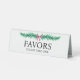 Design features Christmas tree branches with little red bow on the top and at the bottom of the table tent.